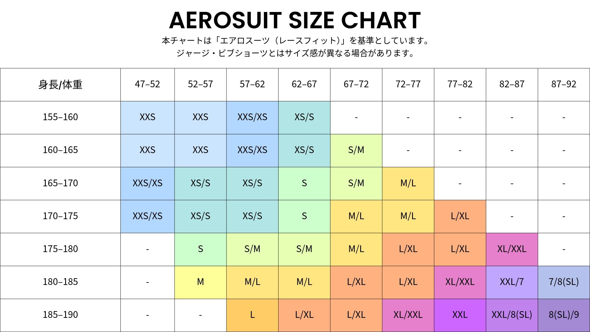 サイクルウェアは伸縮性があり、それぞれの体型で着用出来る範囲が広く、ご自身のサイズ選択が難しい場合があります。以下のチャートで適正サイズのご参考にしてみてください。