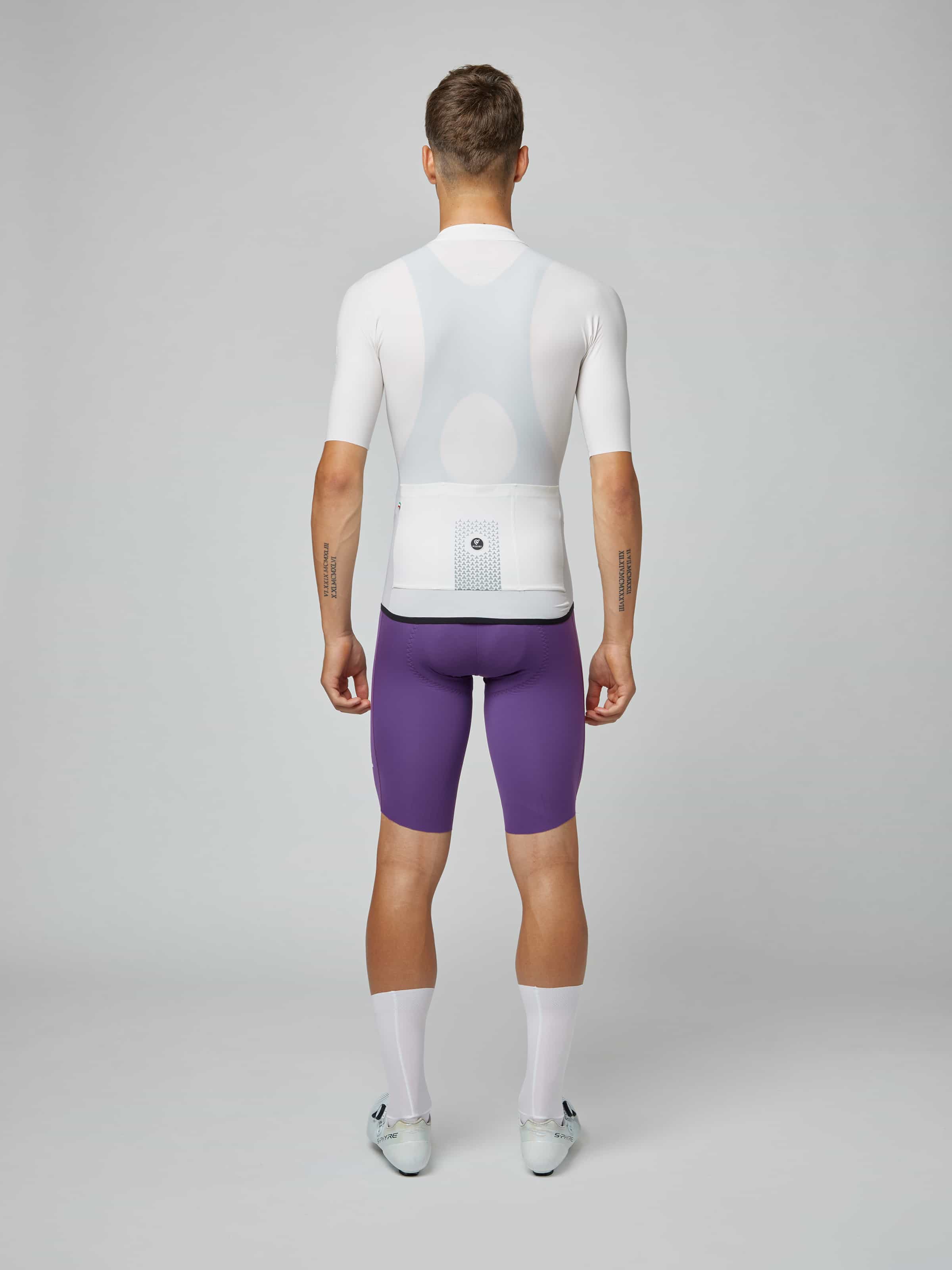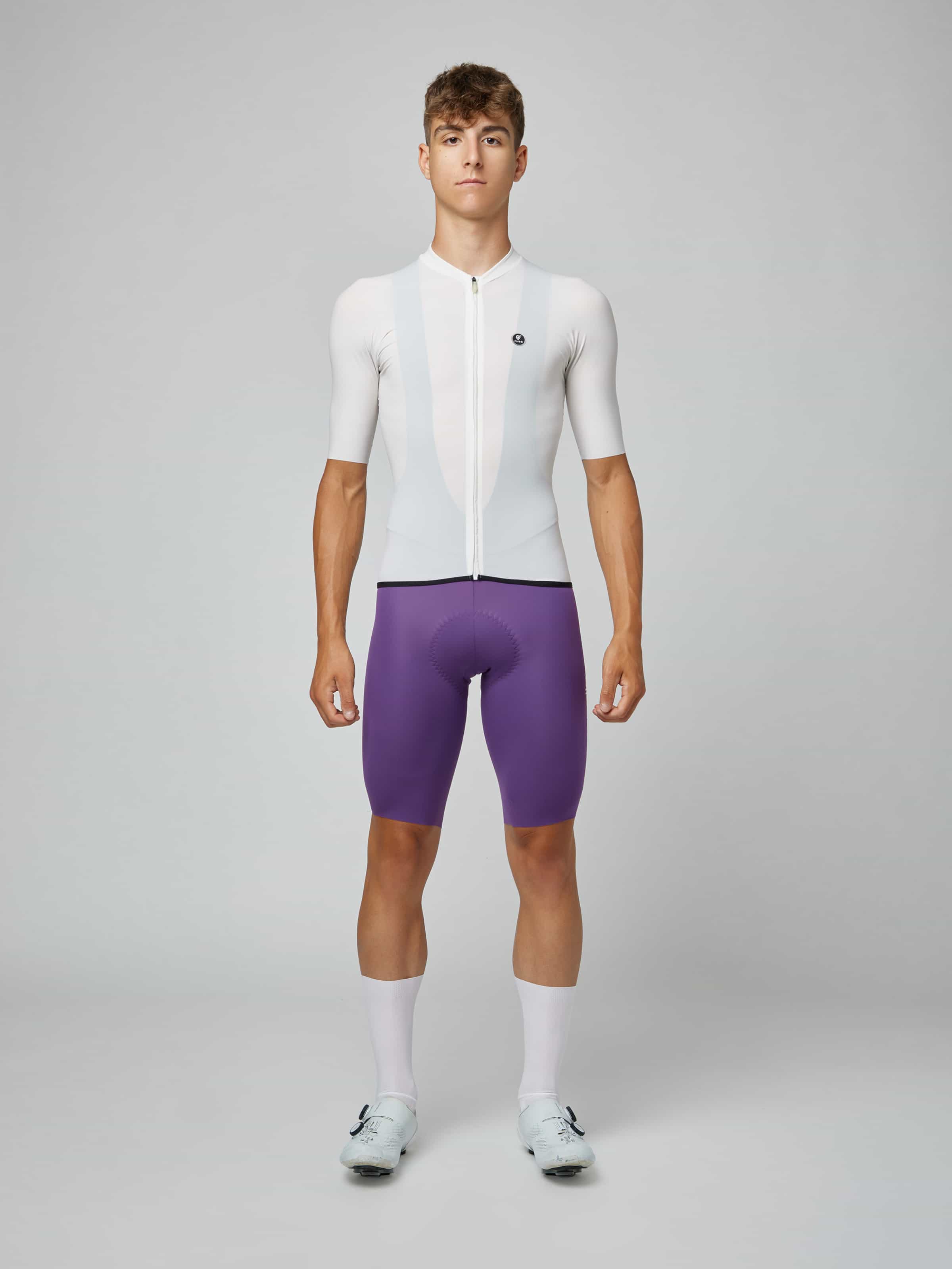 - 高密度ストレッチマイクロファイバーの双方向伸縮が身体に完璧にフィットし、締め付け感なく空力抵抗を低減